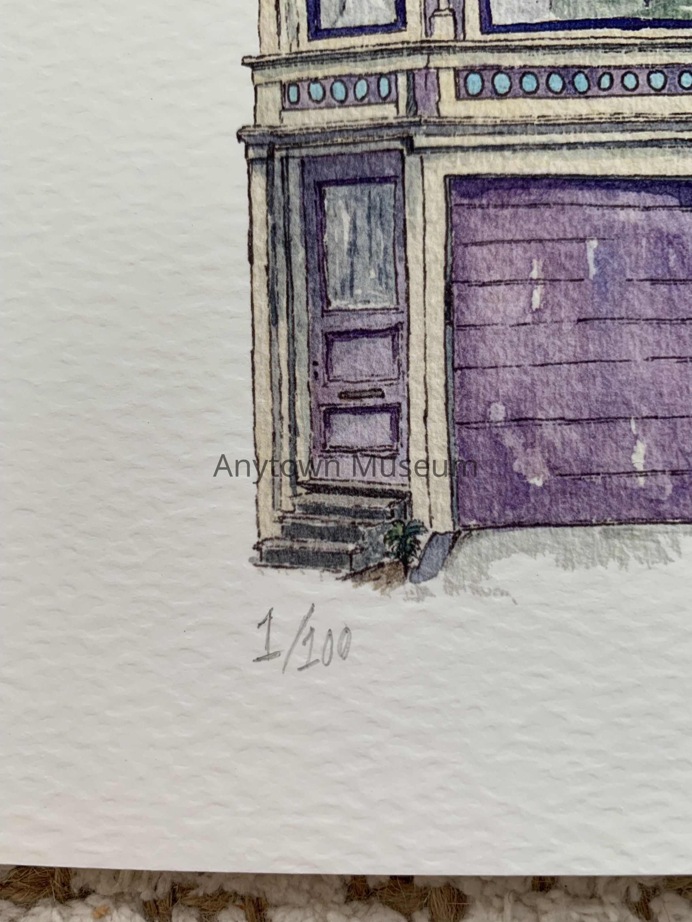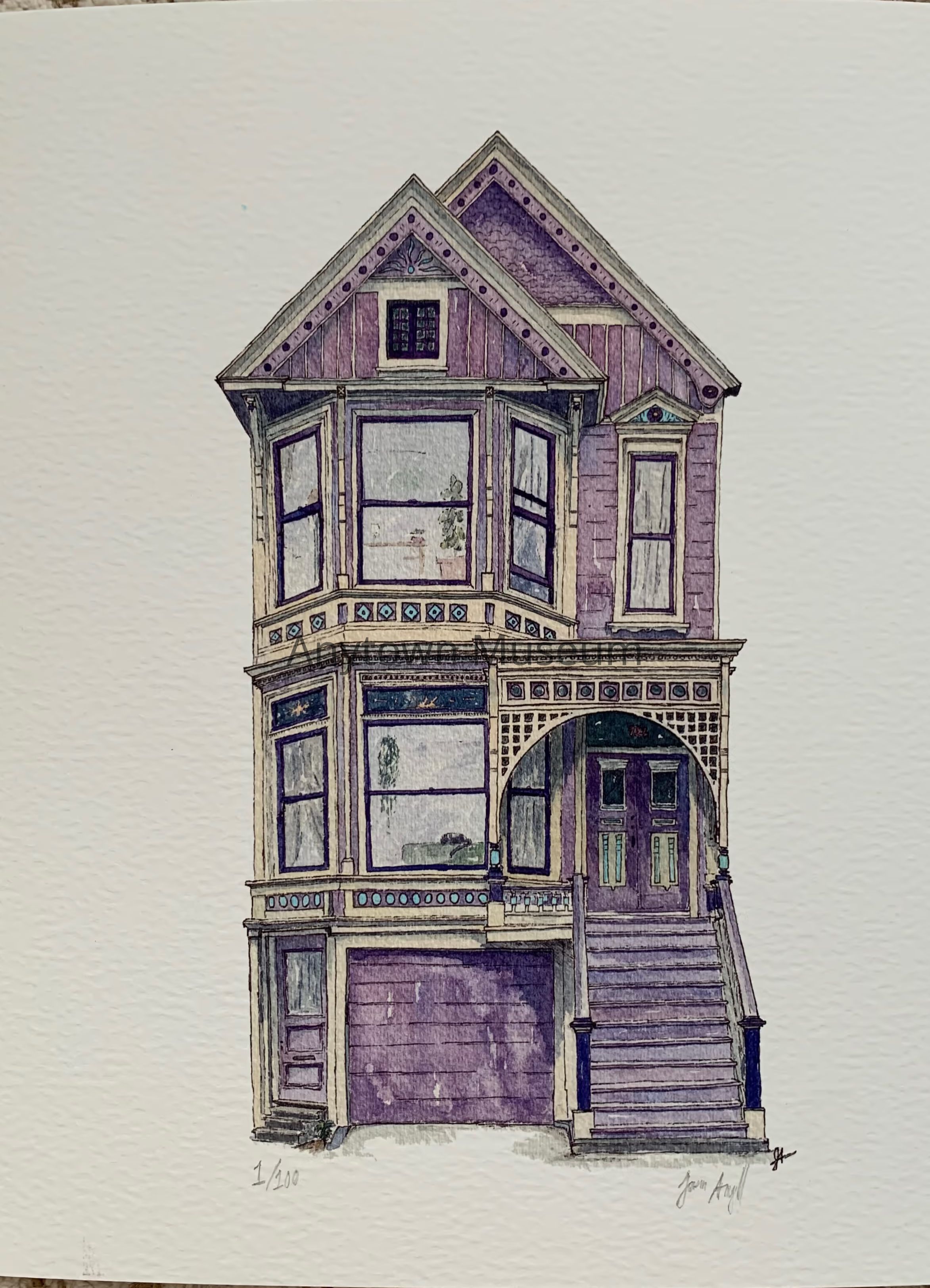Digital art print of the original watercolor painting depicting a purple house in San Francisco, CA.