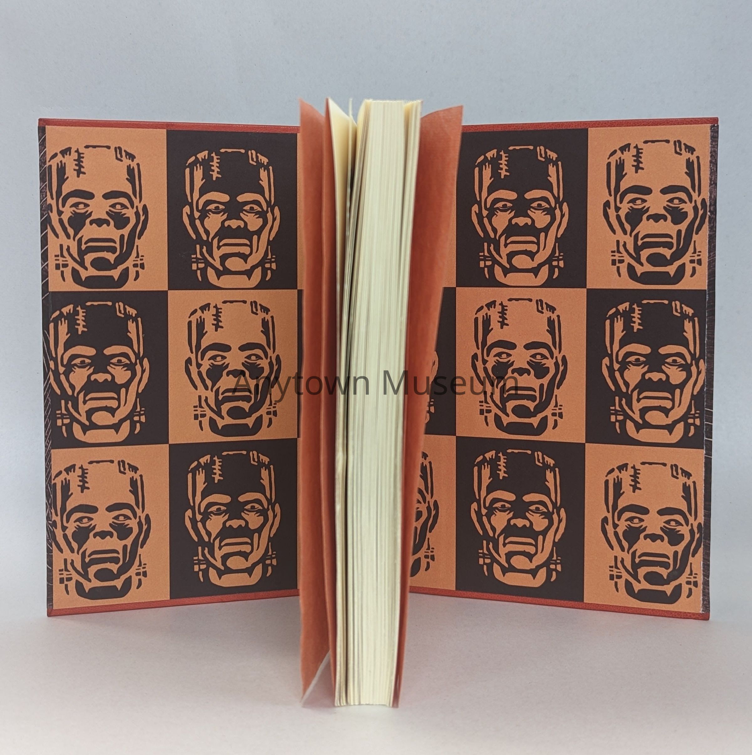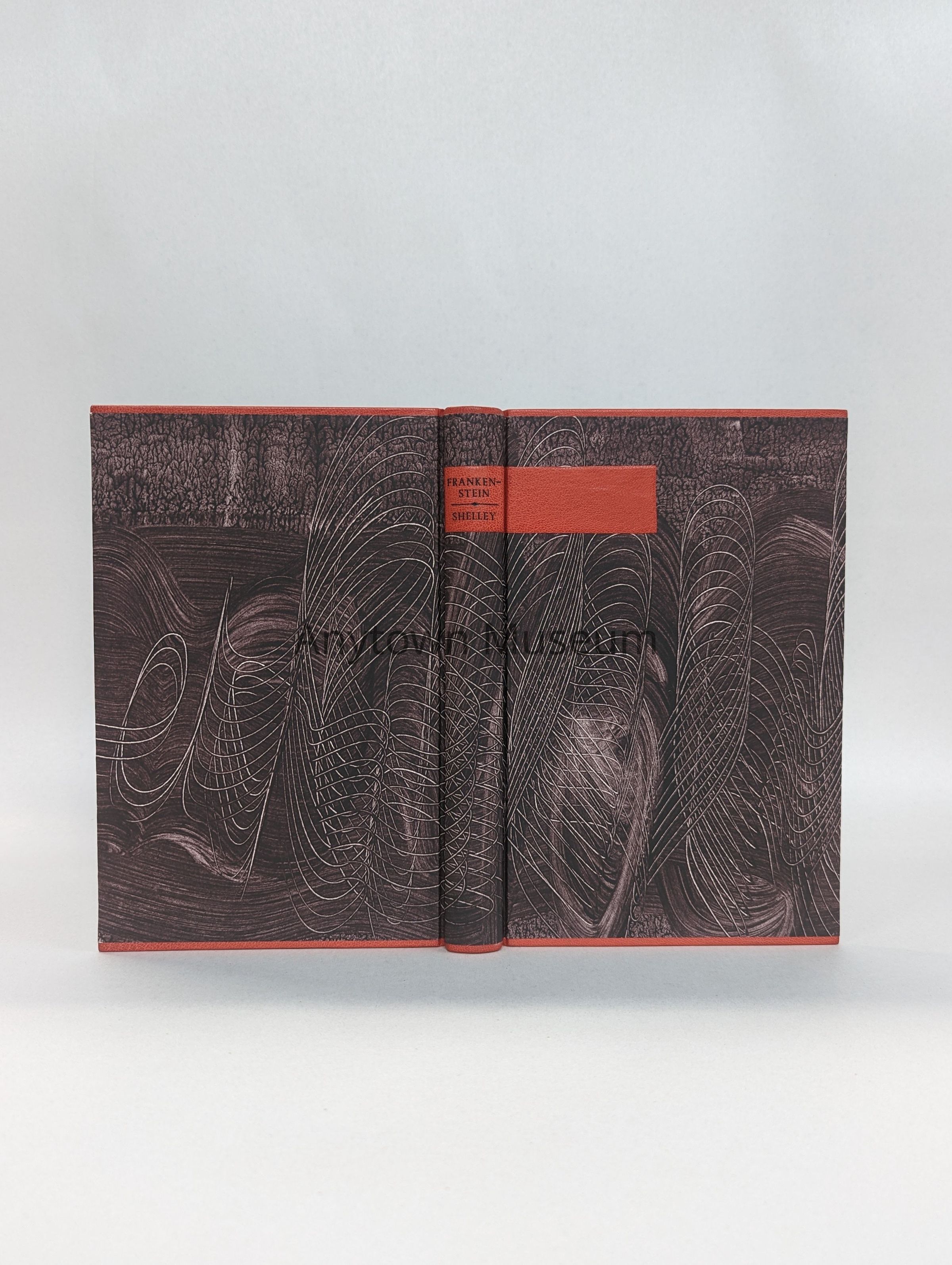 Purple and red book, with red leather strips at top and bottom and a red leather label stamped with "Frankenstein" and "Mary Shelley"