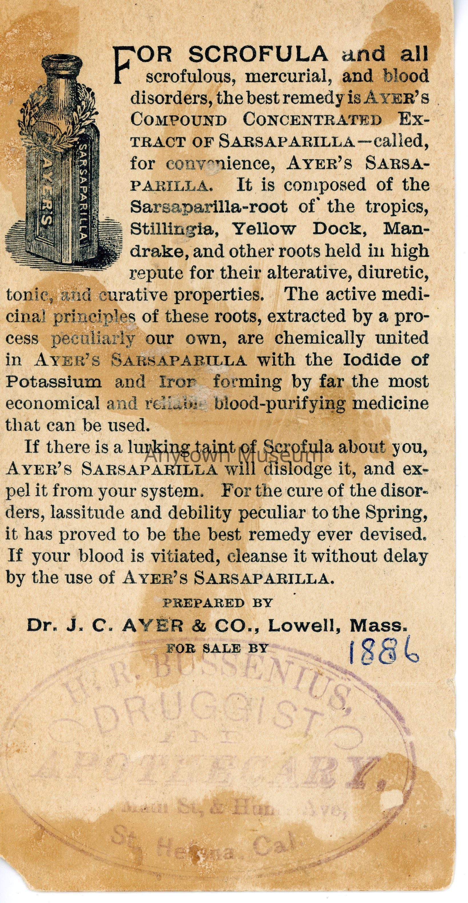 Ayer’s Sarsaparilla claimed to cure a plethora of diseases and maladies, marketed as a universal cure for at least 25 health conditions including edema, “female weaknesses,” rheumatism, tumors, neuralgia, blood impurities, and syphilis in addition to promoting energy and strength. Ayer’s Sarsaparilla would be the company’s greatest success.