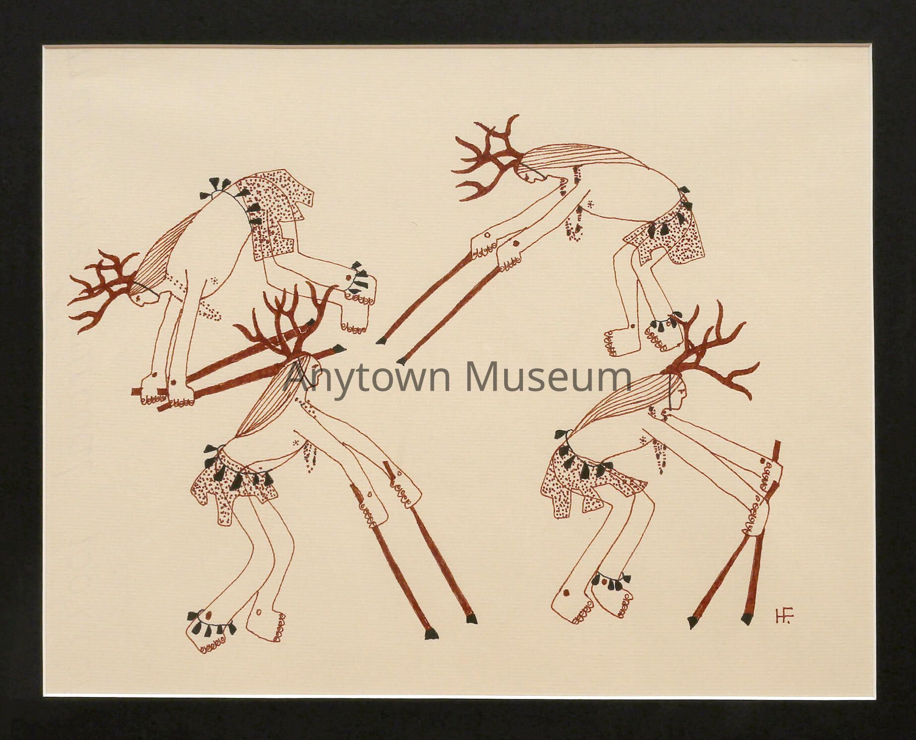 Pen and ink on paper depiction of four stylized deer dancers, each wearing an antler headdress, necklace, loincloth, a belt of pendants, and an anklet on their right ankle. They are each holding a stick in each hand representing the deer's front legs.