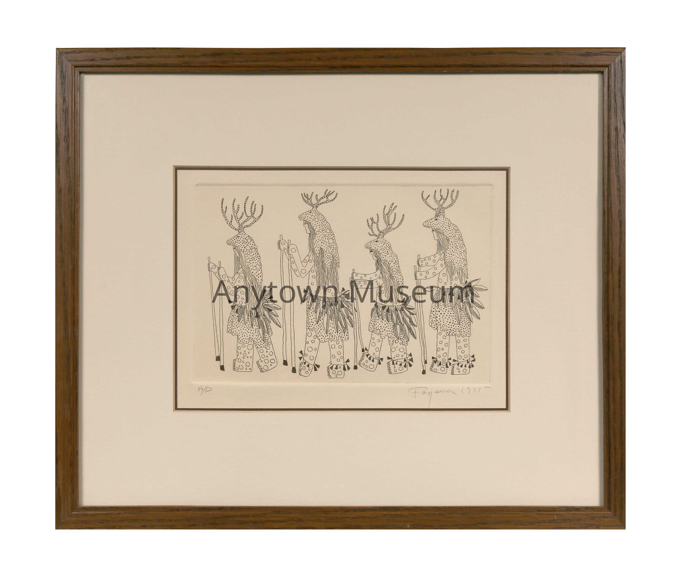 Depiction of four stylized deer dancers, each wearing headdresses including the head, antlers, and upper skin of a deer, probably deerskin loin cloths, feather bands around their waists. All have circles pained on their upper bodies, arms and legs, and all but the front dancer have pendant anklets on both feet. They are each holding sticks representing the legs of the deer.