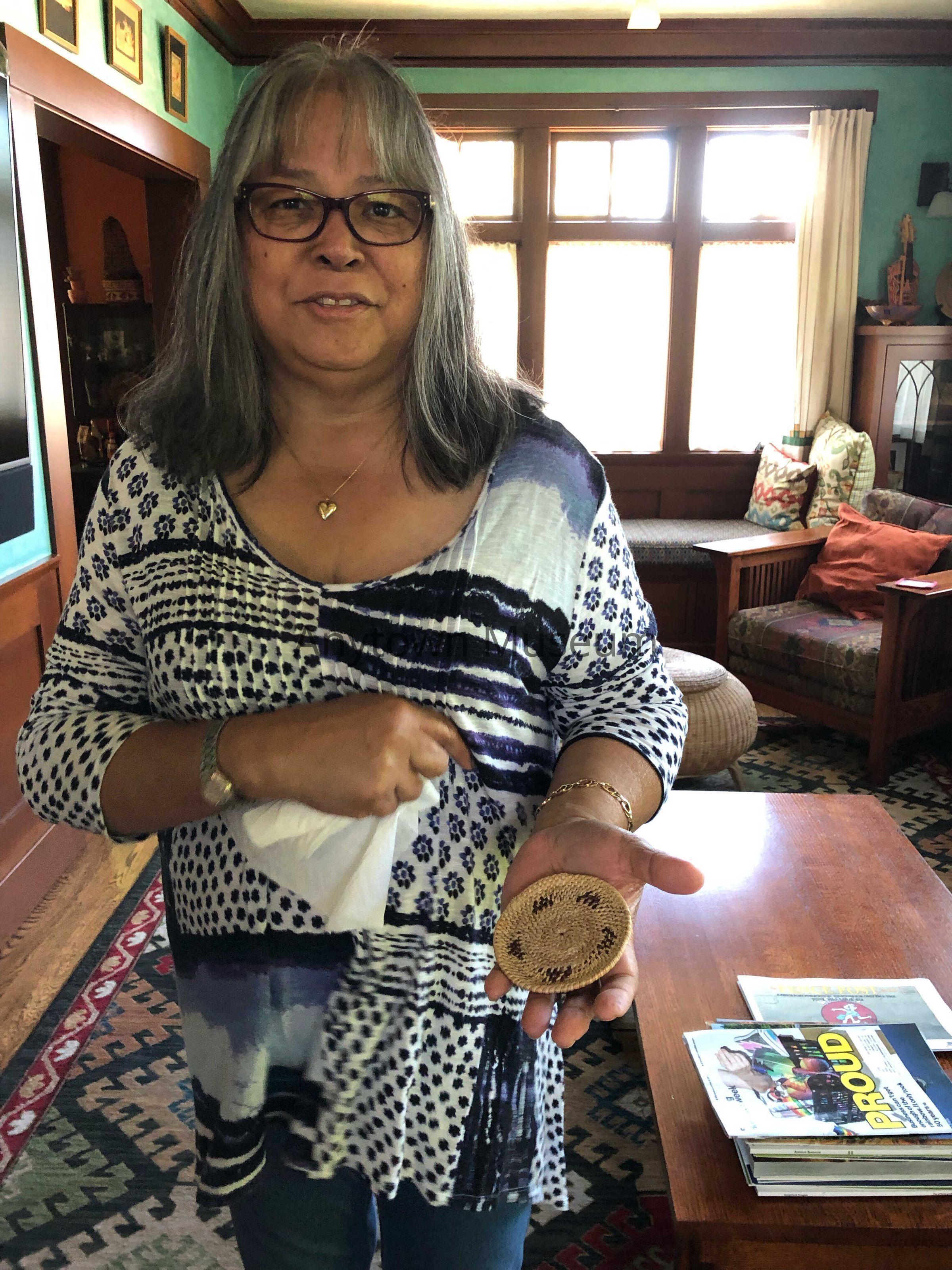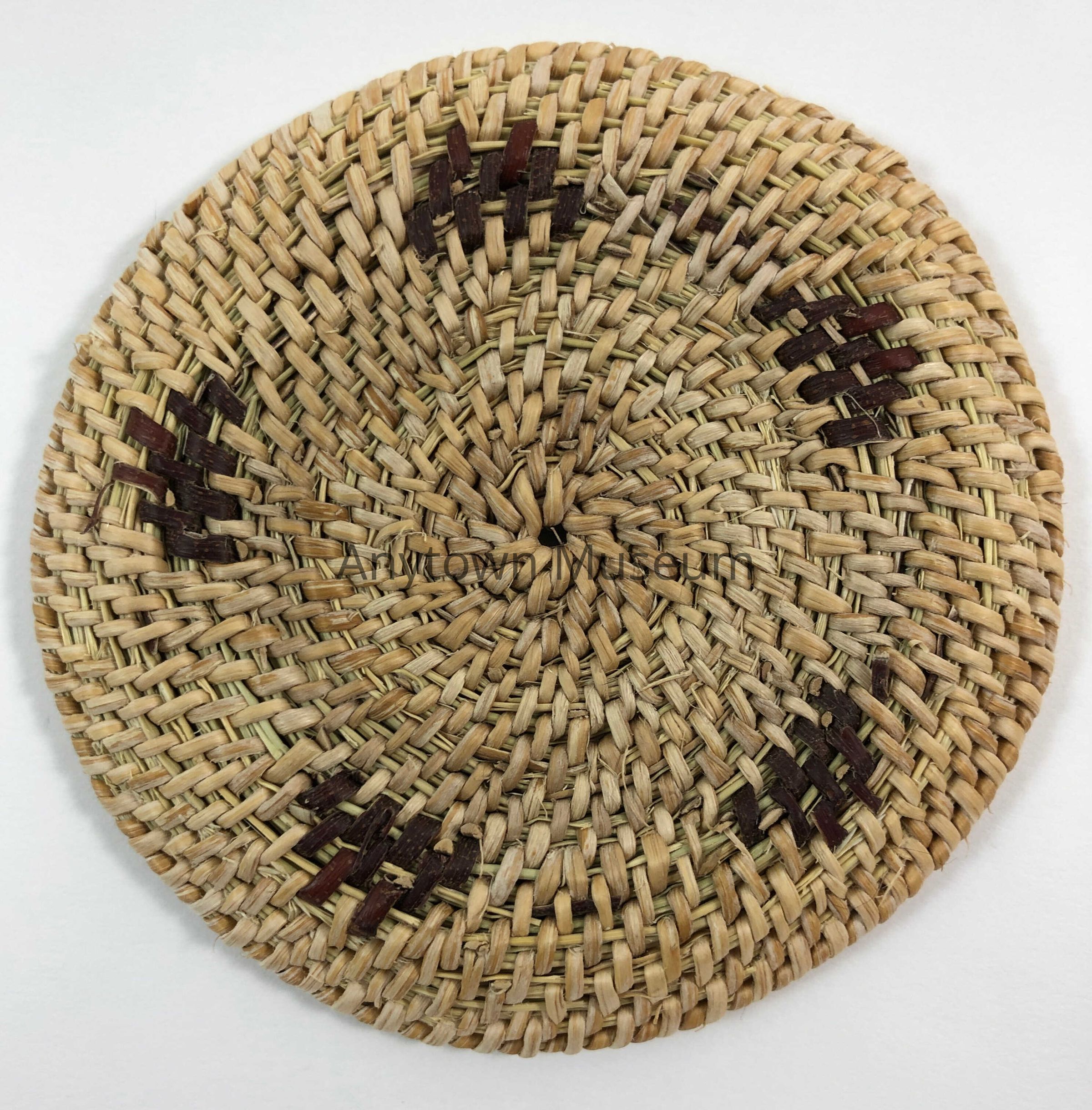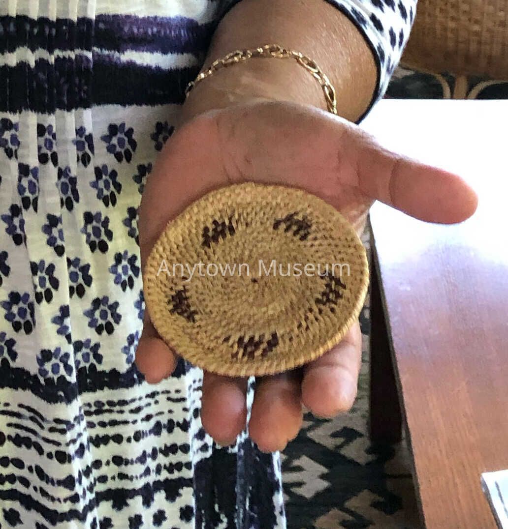 This is a miniature version of a flat basket used to sift acorn flour, created by noted Miwuk weaver Jennifer Bates. The pounded acorn is placed on the tray and sifted to separate larger particles for additional pounding to form a fine flour. Jennifer informed us that she had begun the start on this basket and as she worked a little further along, the basket told her this is what it wanted to be.