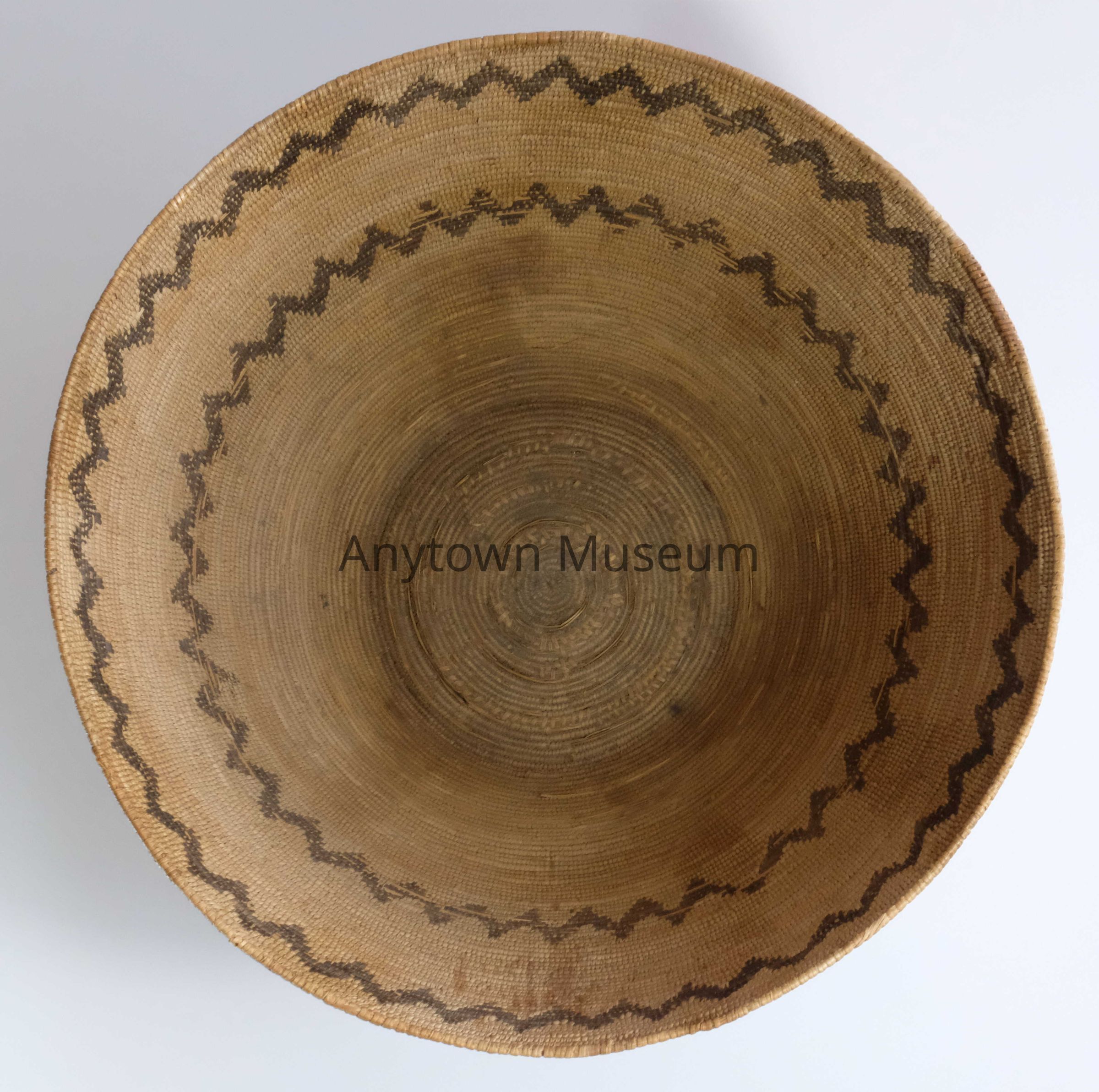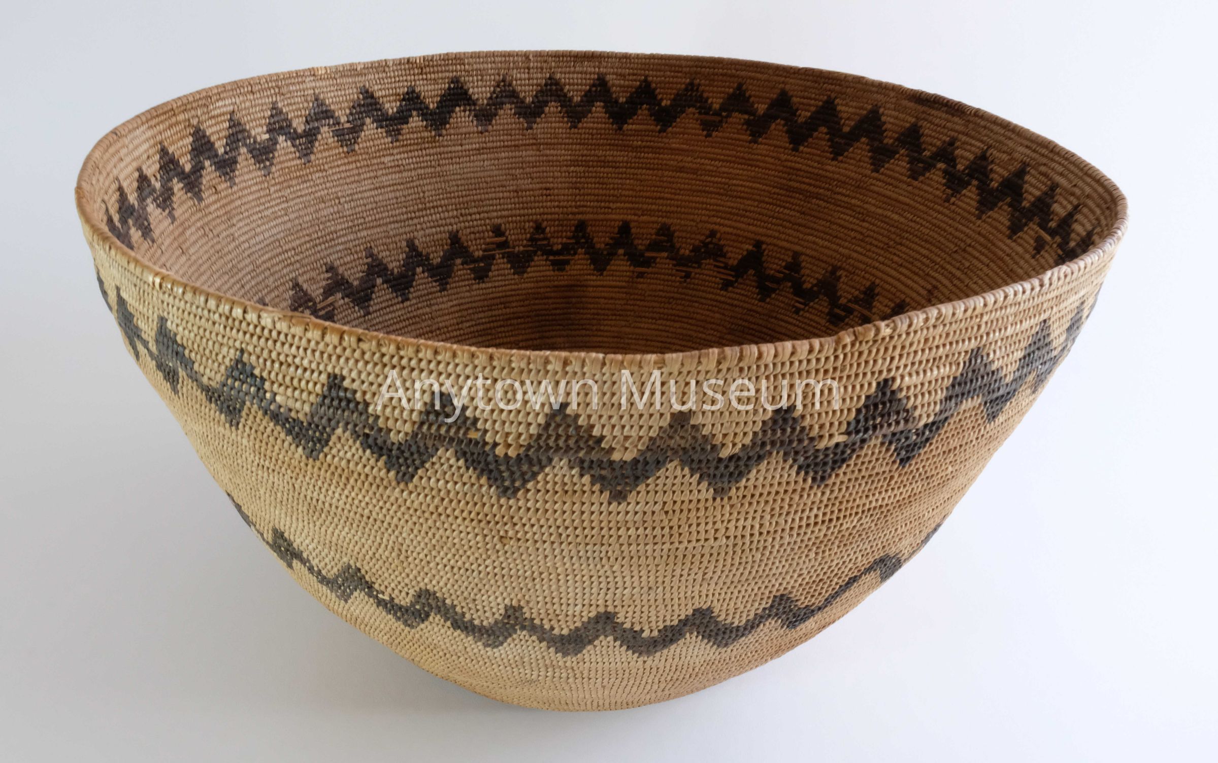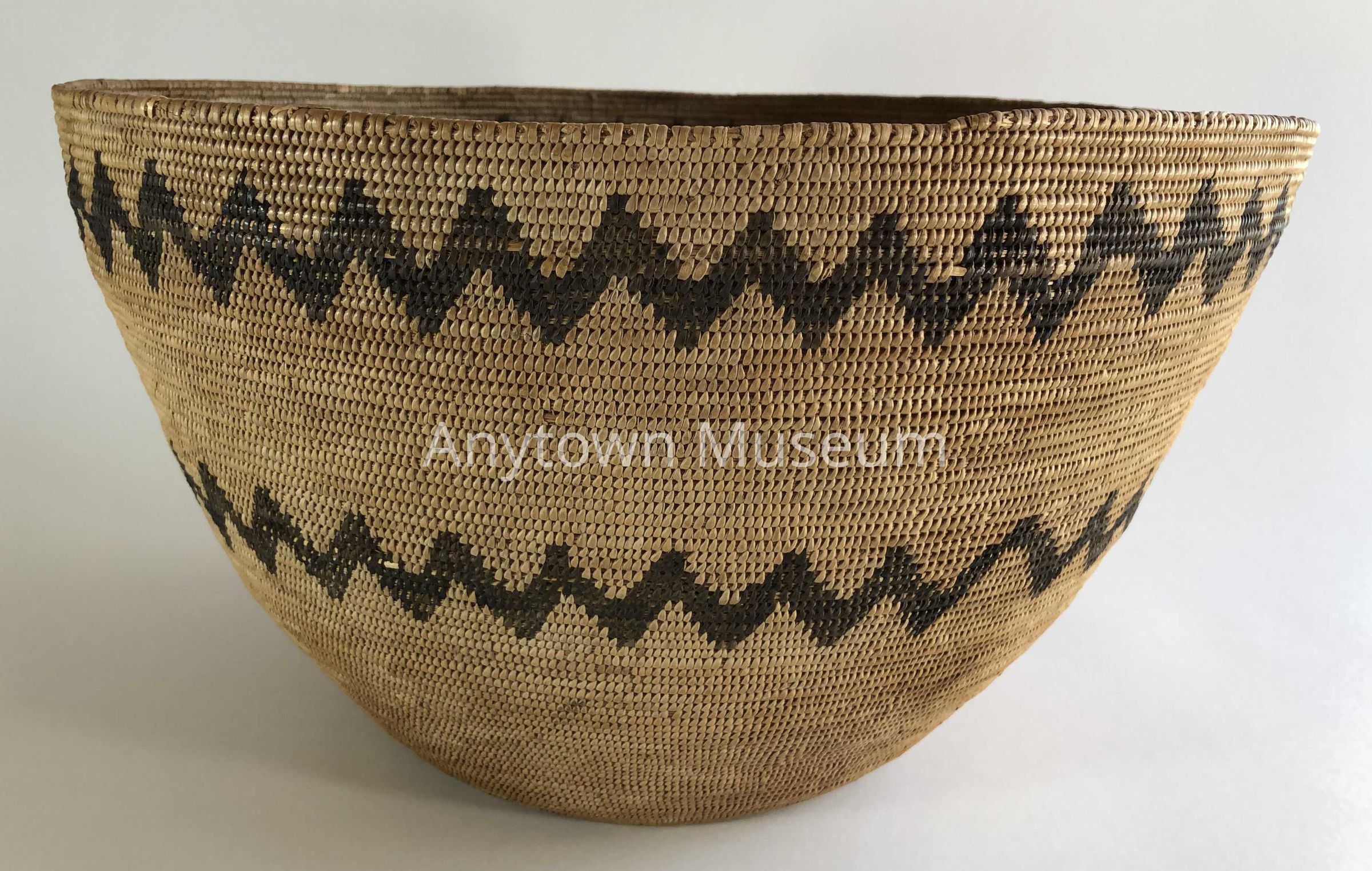 Large Western Mono or Monache basket used for cooking acorn mush, decorated with two wide ziz-zag bands. There is a good deal of wear on the interior and the base from use, and nice native repairs are visible on the base.
