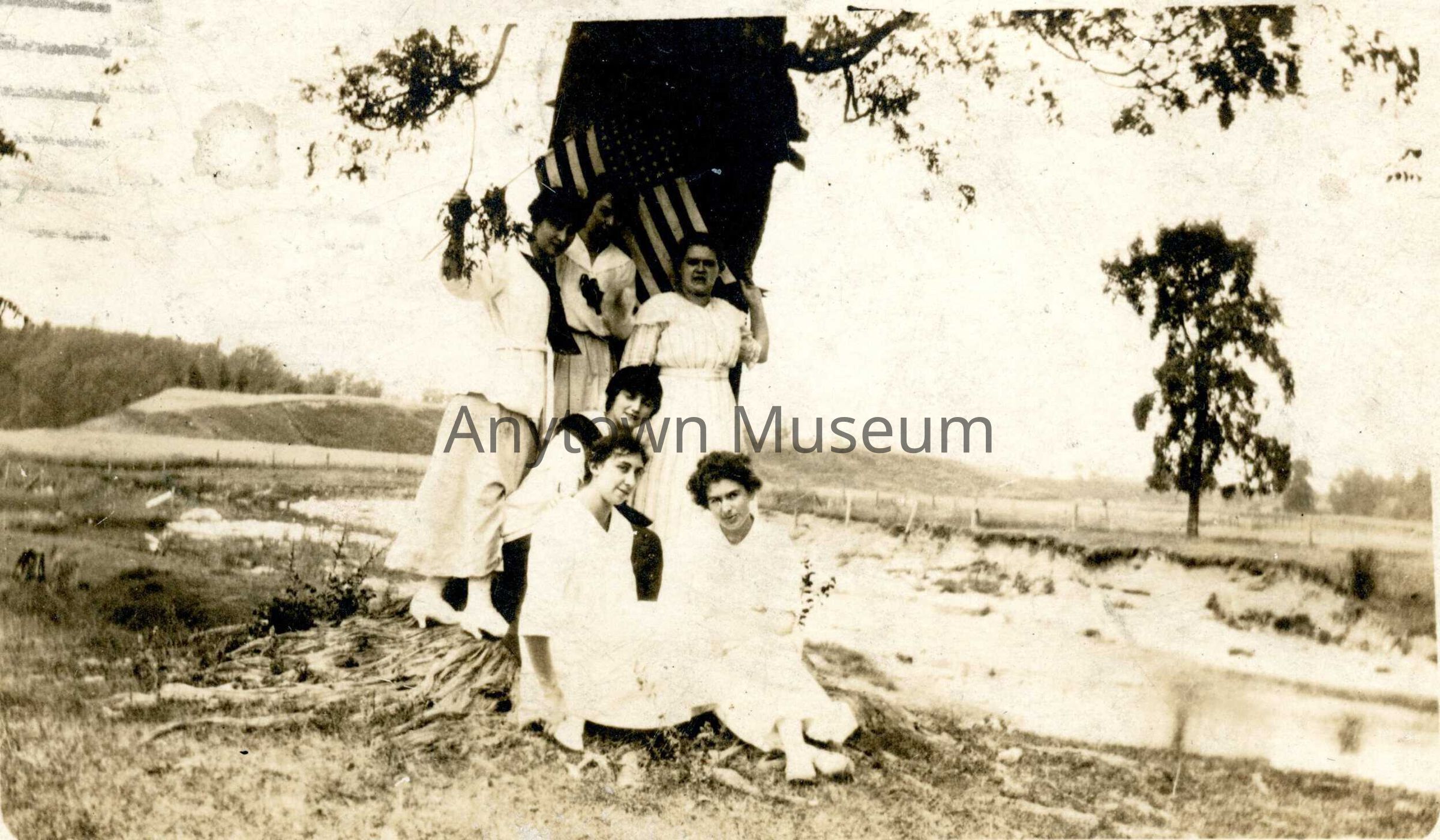 Photograph postcard of six young women wearing white dresses, one holding an American flag, in front of the trunk of a large tree.
