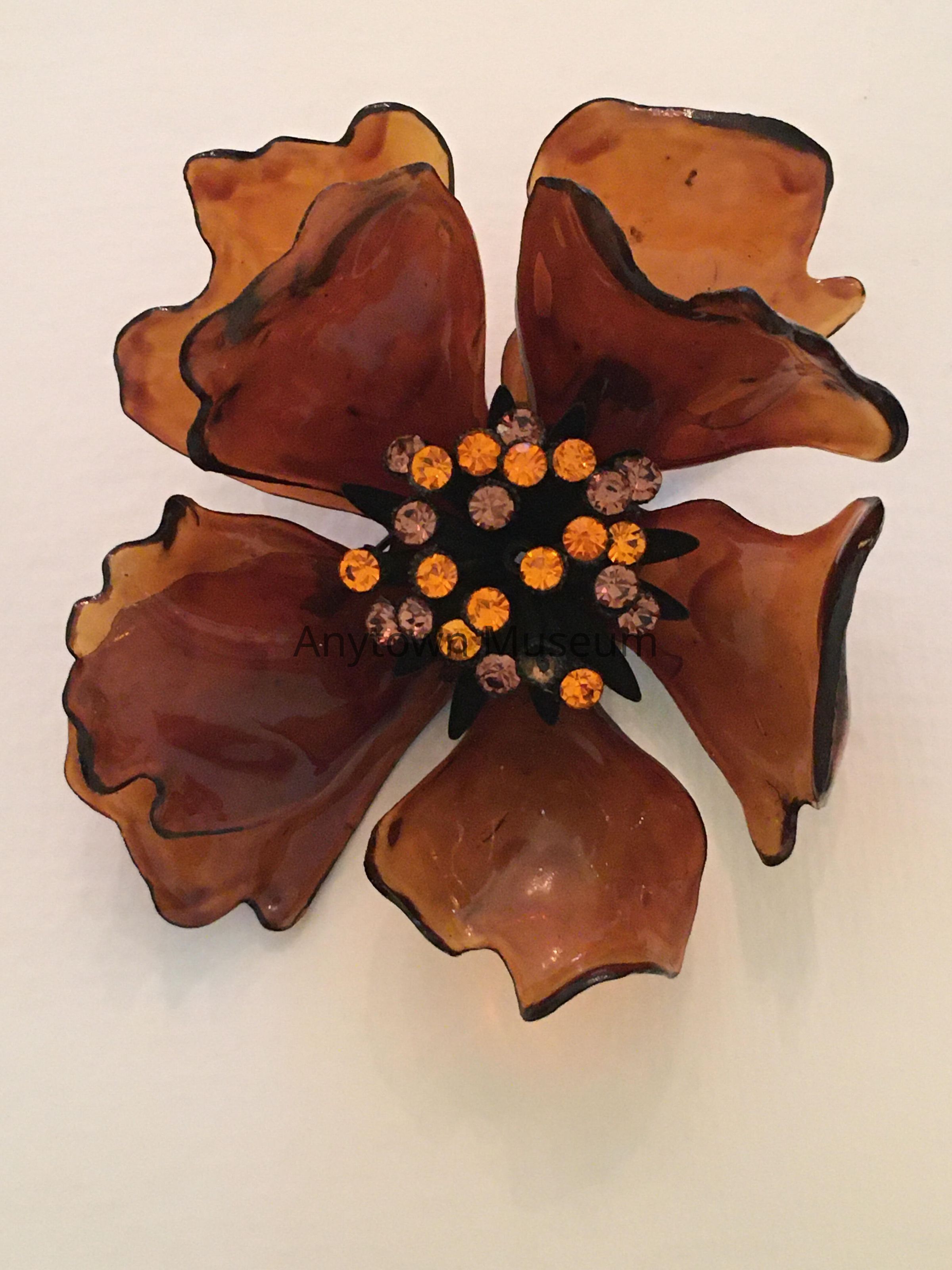 Brown Plastic Flower Brooch Jewelry Description Brown plastic flower with crystal interior. PDF Viewer Close × Profile Viewer Close × Entry/Object ID2019.7.17AcquisitionAccession2019.7Source or DonorHandumy JeanAcquisition MethodGiftCredit LineGift of the estate of Handumy JeanMade/CreatedArtist InformationArtistUnknownDate madecirca 1950DimensionsWidth3 inDepth3/4 inLength3 inMaterialsMaterialplasticcrystalMaterial Notesplastic is translucent
