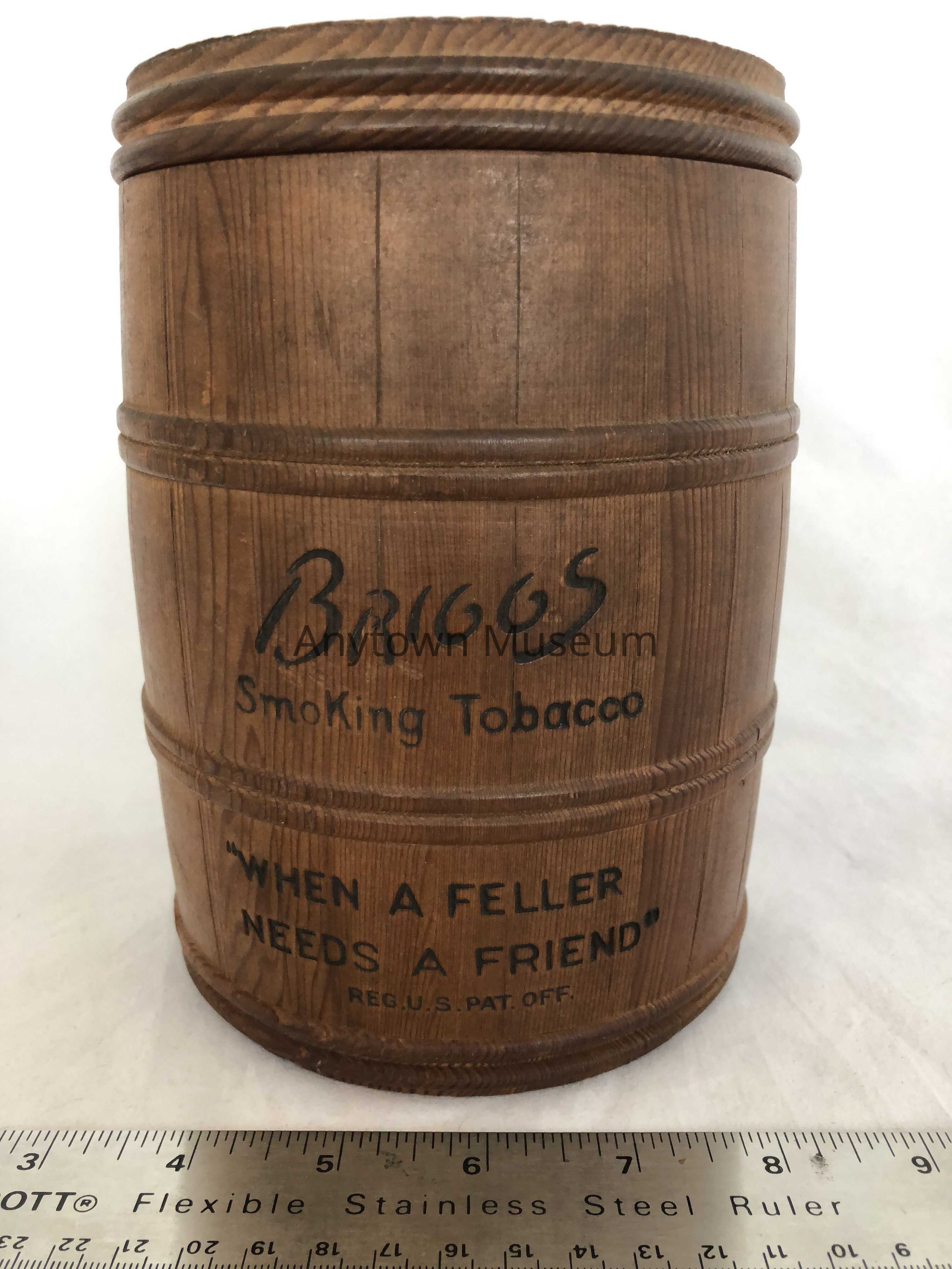 Wooden Briggs smoking tobacco humidor in the shape of a small barrel. The lid attaches with a thin steel strip which fits into the top inside of the barrel, then into a groove thereby locking it in place. The front reads, Briggs Smoking Tobacco “When a feller needs a friend” Reg. U.S. Pat. Off. The top reads, Briggs Smoking Tobacco Aged in the Wood. Near the top rim is written Turn To Open below which is an arrow. There is a ceramic disc set in metal in the inside of the lid which says, “When Color Fades Add Cold Water” around the outside and, “Aztec U.S. Pat. Off.” near the center.